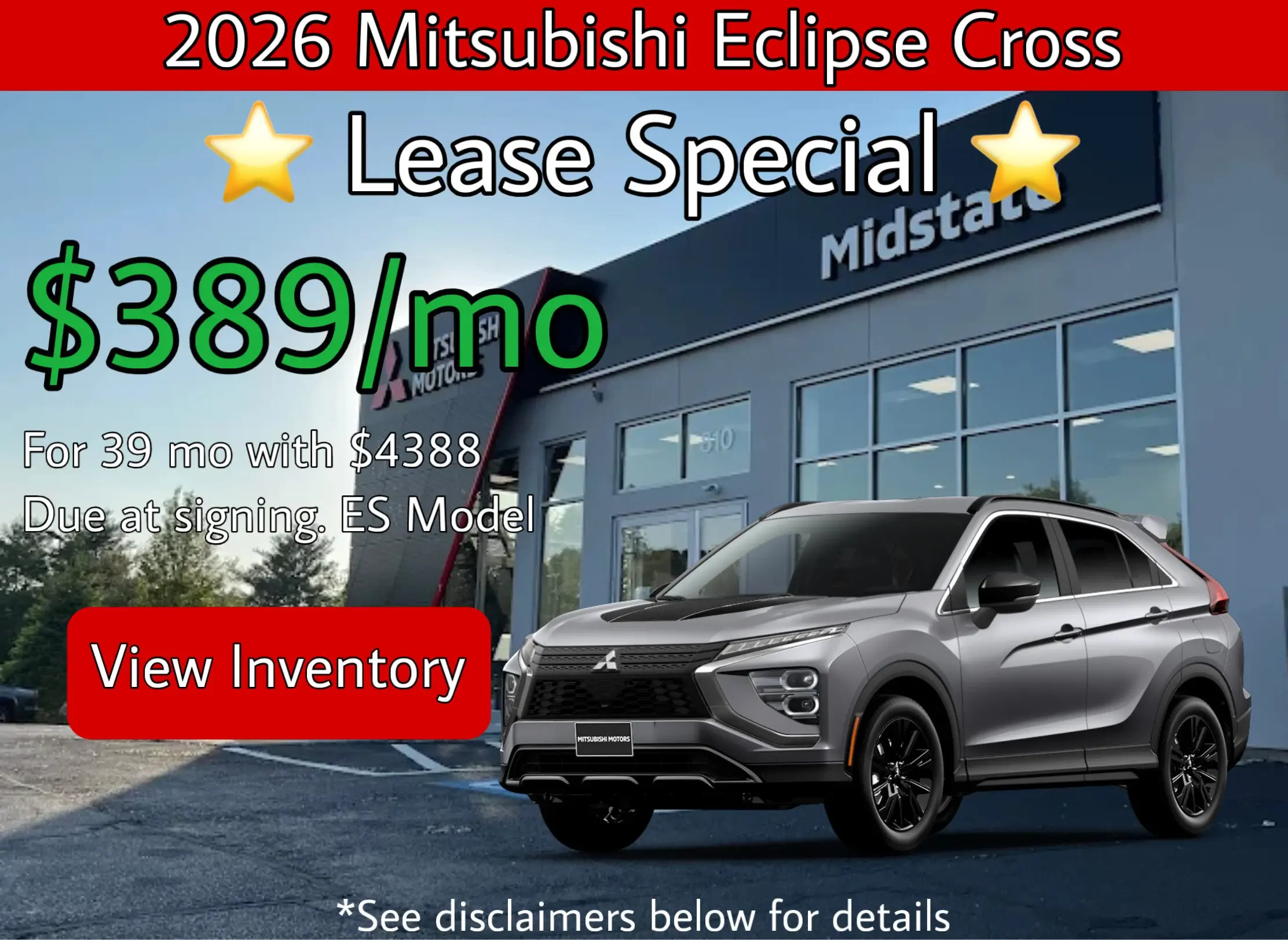 Lease example for 2026 Eclipse Cross ES 1.5T S-AWC, MSRP $27,955 plus $1,745 ($1,870 Alaska / Hawaii) destination and handling. Available through Santander Consumer USA, subject to approved credit and insurance. Net capitalized cost is $26,296 and includes $595 acquisition fee. Not all customers will qualify. Option to purchase at lease end at price determined at lease signing. Lessee is responsible for maintenance, repairs, excess wear, and $0.25 per mile over 10,000 miles/year and $395 disposition fee if applicable. Other lease terms/details apply. This offer may not combine with factory cash rebates. Offer valid from 02/03/2026 through 03/02/2026