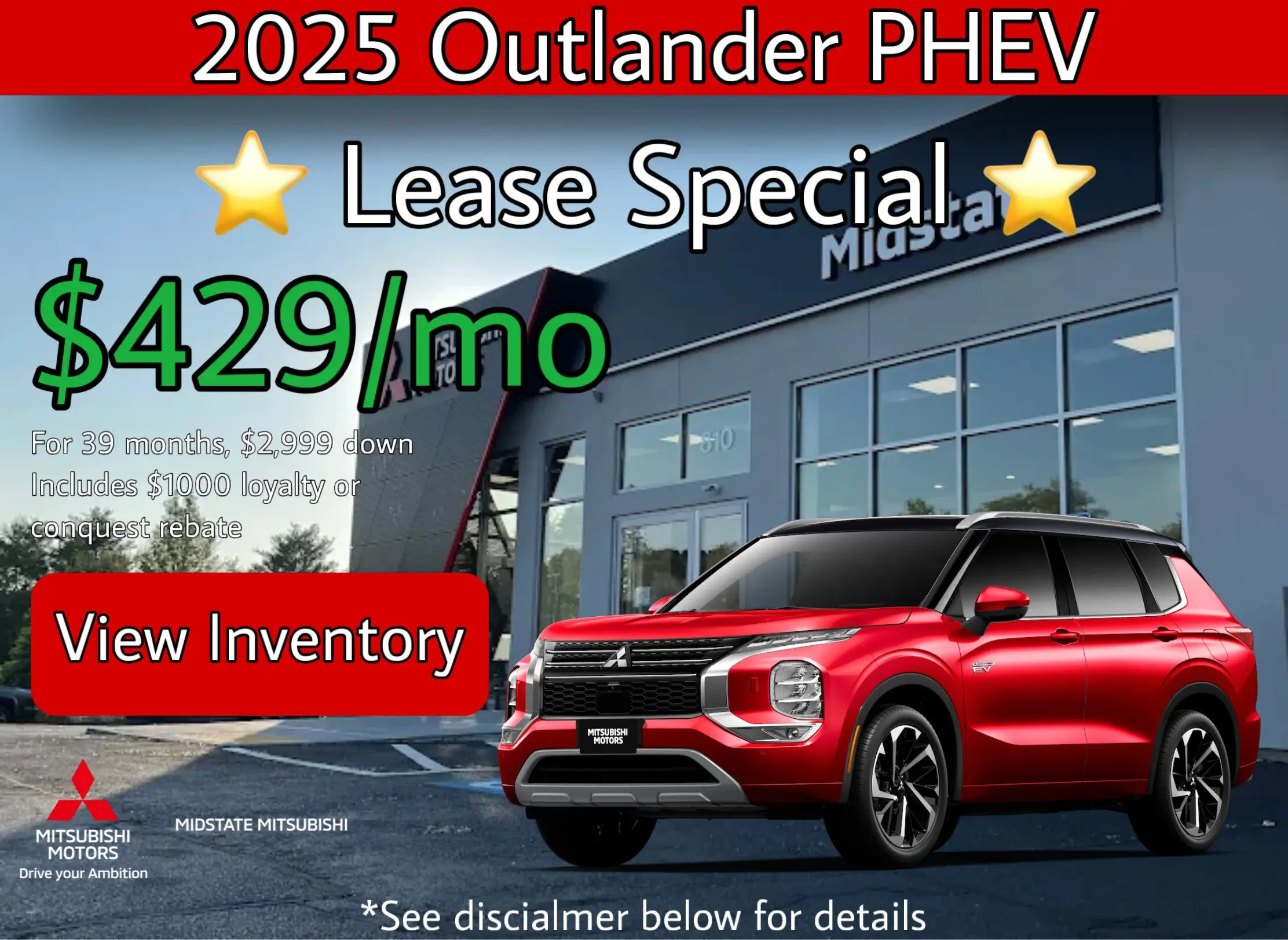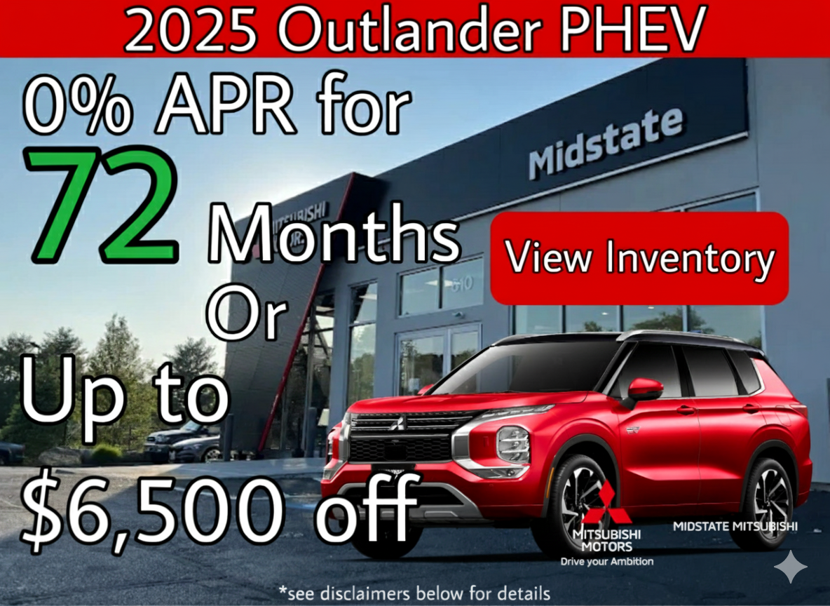 Lease example for 2025 Outlander PHEV SE S-AWC , MSRP $43,515 plus $1,595 ($1,720 Alaska / Hawaii) destination and handling. Net capitalized cost is $40,706 and includes $595 acquisition fee, $1,000 Special Lease Customer Cash, and $1,000 Loyalty or Conquest Rebate. Available through Santander Consumer USA, subject to approved credit and insurance. Not all customers will qualify. Option to purchase at lease end at price determined at lease signing. Lessee is responsible for maintenance, repairs, excess wear, and $0.25 per mile over 10,000 miles/year and $395 disposition fee if applicable. Other lease terms/details apply. This offer may not combine with factory cash rebates. Offer valid from 02/03/2026 through 03/02/2026