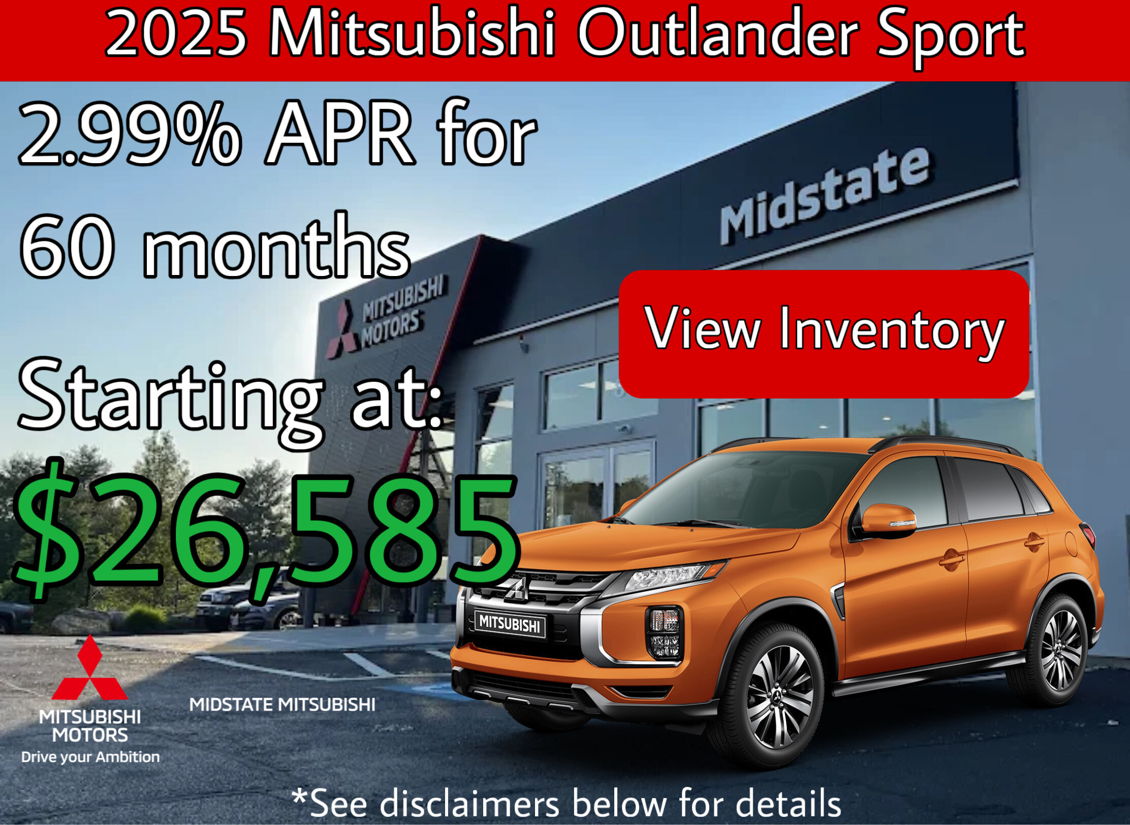 Available through Santander Consumer USA, subject to approved credit and insurance. Not all customers will qualify. Price, terms and vehicle availability may vary. This offer may not combine with factory cash rebates. See your participating Mitsubishi dealer for details. Offer valid from 02/03/2026 through 03/02/2026