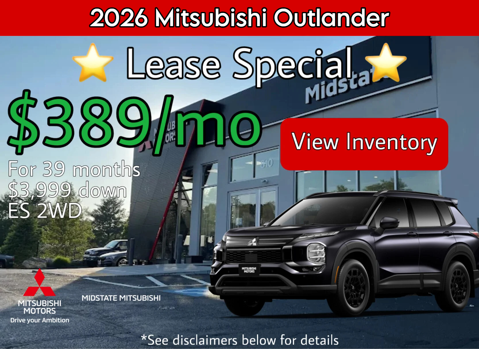 Lease example for 2026 Outlander ES 1.5T 2WD, MSRP $30,460 plus $1,745 ($1,870 Alaska / Hawaii) destination and handling. Available through Santander Consumer USA, subject to approved credit and insurance. Net capitalized cost is $28,801 and includes $595 acquisition fee. Not all customers will qualify. Option to purchase at lease end at price determined at lease signing. Lessee is responsible for maintenance, repairs, excess wear, and $0.25 per mile over 10,000 miles/year and $395 disposition fee if applicable. Other lease terms/details apply. This offer may not combine with factory cash rebates. Offer valid from 02/03/2026 through 03/02/2026