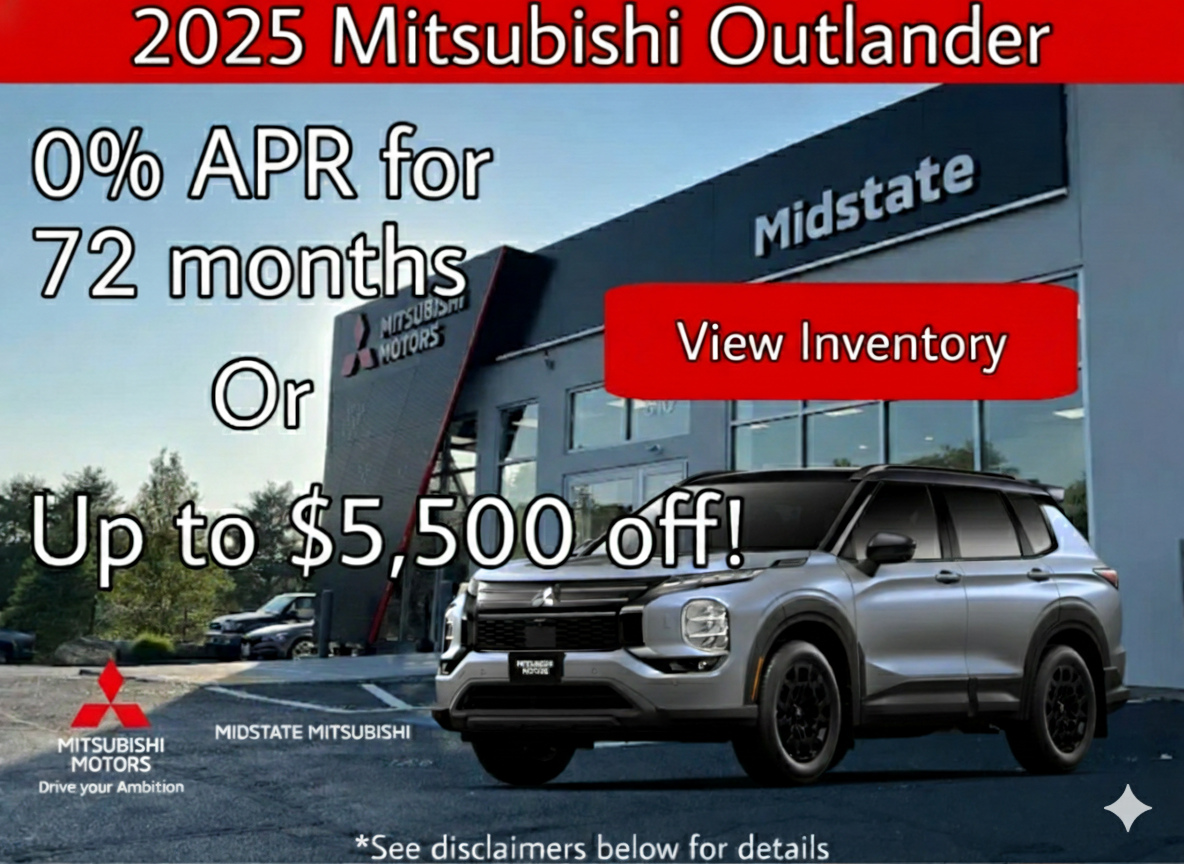 Rebates include $4000 customer cash rebate available on the Outlander Platinum Edition, $500 Loyalty Rebate. $500 VIP Rebate and $500 Military Rebate. Not all customers will qualify for all rebates. Cannot be combined with Special APR or Special Lease offers. See your participating Mitsubishi dealer for details. Offer valid through 03/02/2026